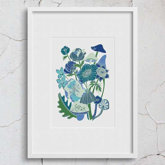 Toadstool Flora & Fauna Stylised Art Print - Cool Blues - A4